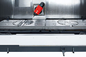Die Y-Achse ist als „Ram“ ausgeführt. Hier werden lange Führungsschuhe verwendet, um die notwendige Stabilität zu gewährleisten. Die hohe Präzision wird durch den Direktantriebsmotor an der Spindel garantiert.