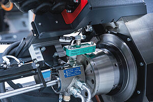 Der elektro-pneumatische Teilefänger in der HYPERTURN 65 wird über M-Funktionen angesteuert. Bei Bedarf fährt er in den Arbeitsbereich vor und schwenkt zur Spindelmitte. Das Fertigteil wird aus dem Spannmittel gestoßen und gelangt in die Auffangschale. Danach fährt der Teilefänger wieder in die Grundstellung, wo das Teil auf ein Stauband abgelegt wird.
