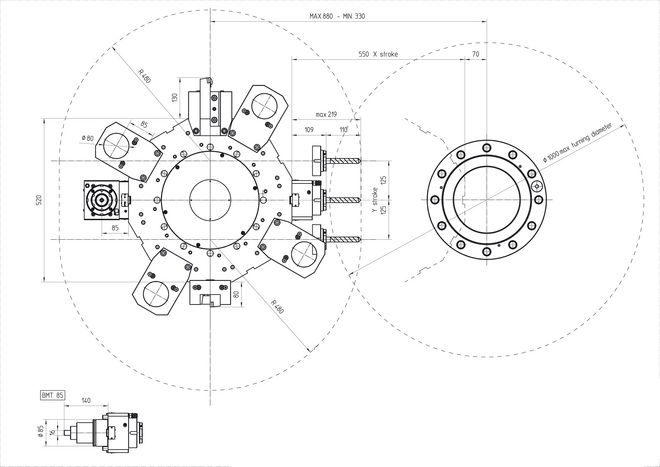 | Verfahrweg in X/Y/Z | 550 / +/- 125 / 2050-4050-6050 mm |