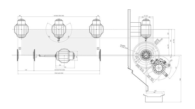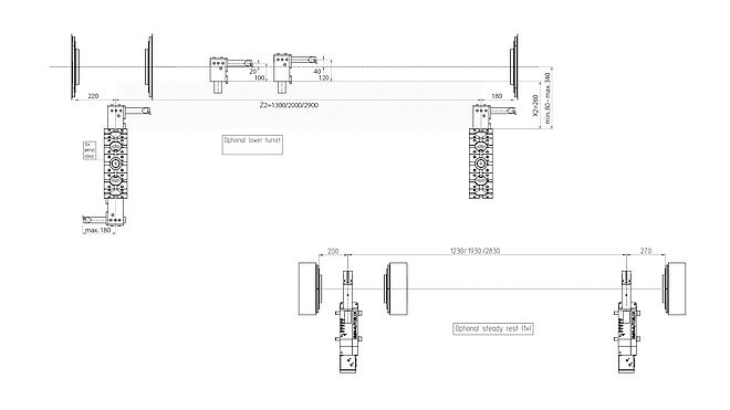Sono disponibili diverse lunette idrauliche per la lavorazione degli alberi. Le parti dell'albero di piccole dimensioni possono essere sostenute con una lunetta a torretta fino a 180 mm. Per pezzi di alberi di grandi dimensioni, è disponibile una lunetta CNC con campi di centraggio fino a 520 mm.